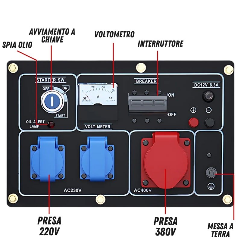 Il Generatore monta un motore diesel 550cc a 4 tempi con avvolgimento in rame, erogando una potenza massima di 9 kW e di 6kw continui. Dotato di avviamento elettrico e telecomando, serbatoio da 15 litri e protezione da sovraccarico (ASD), gestisce carichi pesanti tramite prese 230V e 380V. Garantisce prestazioni elevate per applicazioni professionali e residenziali.